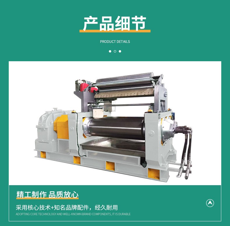 主要用于橡膠的塑煉、混煉、熱煉、壓片等工藝過程。通過兩個相向旋轉(zhuǎn)的輥筒對橡膠進行擠壓、剪切和混合,以達到塑化和均勻混合的效果,從而提高橡膠制品的品質(zhì)。